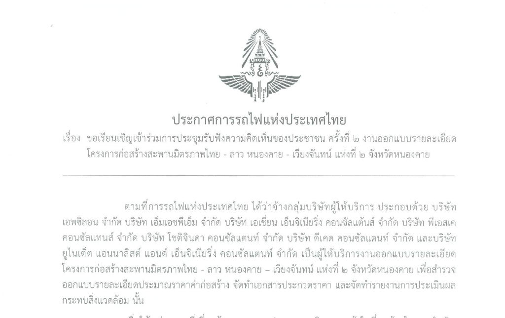 ขอเรียนเชิญเข้าร่วมการประชุมรับฟังความคิดเห็นของประชาชน ครั้งที่ 2 งานออกแบบรายละเอียด โครงการก่อสร้างสะพานมิตรภาพไทย - ลาว หนองคาย - เวียงจันทน์ แห่งที่ 2 จังหวัดหนองคาย ในวันพฤหัสบดีที่ 14 สิงหาคม พ.ศ. 2568 เวลา 08.30 – 12.00 น. ณ ห้องประชุมนาคารา 1 โรงแรมรอยัลนาคาราและคอนเวนชั่นเซ็นเตอร์ หนองคาย ตำบลมีชัย อำเภอเมืองหนองคาย จังหวัดหนองคาย เพื่อนำเสนอข้อมูลโครงการ ผลการศึกษาผลกระทบสิ่งแวดล้อมของโครงการ ร่างมาตรการป้องกันและแก้ไขผลกระทบสิ่งแวดล้อม และร่างมาตรการติดตามตรวจสอบผลกระทบสิ่งแวดล้อม และการมีส่วนร่วมของประชาชน พร้อมทั้งรับฟังความคิดเห็นและข้อเสนอแนะต่อโครงการ สำหรับนำไปประกอบการศึกษาของโครงการให้มีความครบถ้วนและเหมาะสมมากยิ่งขึ้น การรถไฟแห่งประเทศไทย จึงขอเรียนเชิญท่านหรือผู้แทน เข้าร่วมการประชุมตามวัน เวลา และสถานที่ดังกล่าว โดยแจ้งความประสงค์มาที่ นางสาวสุทธินี ศิลปสิทธิ์ นักวิชาการสิ่งแวดล้อม โทรศัพท์ 0 2763 2828 ต่อ 4085 โทรศัพท์มือถือ 06 1198 6451 ไปรษณีย์อิเล็กทรอนิกส์ suthinee.s@uaeconsultant.co.th
