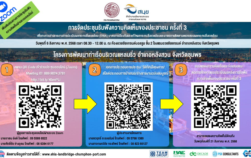ขอประชาสัมพันธ์เพิ่มเติมช่องทางการประชุมรับฟังความคิดเห็นของประชาชน ครั้งที่ 3 เพื่อทบทวนร่างรายงานการประเมินผลกระทบสิ่งแวดล้อม (EHIA) มาตรการป้องกันและแก้ไขผลกระทบสิ่งแวดล้อมและมาตรการติดตามตรวจสอบผลกระทบสิ่งแวดล้อม โครงการพัฒนาท่าเรือบริเวณแหลมริ่ว อำเภอหลังสวน จังหวัดชุมพร