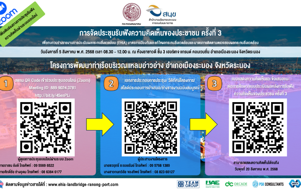 ขอประชาสัมพันธ์เพิ่มเติมช่องทางการประชุมรับฟังความคิดเห็นของประชาชน ครั้งที่ 3 เพื่อทบทวนร่างรายงานการประเมินผลกระทบสิ่งแวดล้อม (EHIA) มาตรการป้องกันและแก้ไขผลกระทบสิ่งแวดล้อมและมาตรการติดตามตรวจสอบผลกระทบสิ่งแวดล้อม โครงการพัฒนาท่าเรือบริเวณแหลมอ่าวอ่าง อำเภอเมืองระนอง จังหวัดระนอง