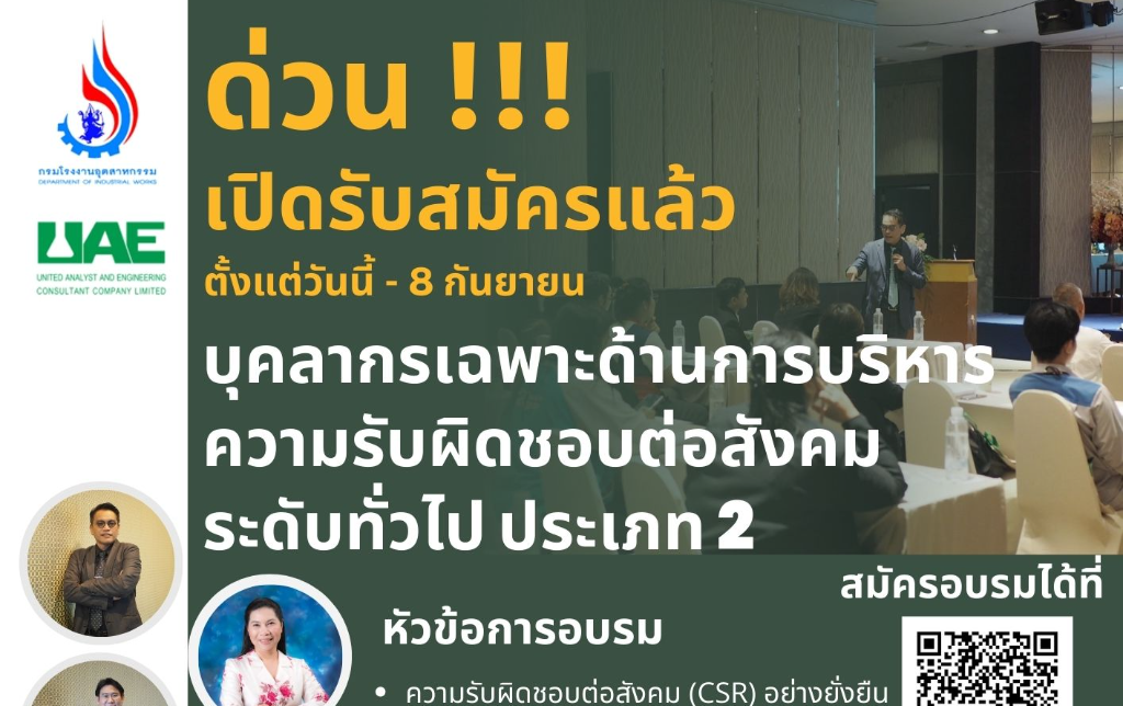ขอประชาสัมพันธ์ หลักสูตร บุคลากรเฉพาะด้านการบริหารความรับผิดชอบต่อสังคมระดับทั่วไป (ประเภท 2) ด่วน!!! รับสมัครอบรมและทดสอบ บุคลากรเฉพาะด้านการบริหารความรับผิดชอบต่อสังคมระดับทั่วไป (ประเภท 2) อบรม วันที่ 1- 3 ตุลาคม พ.ศ. 2568 (ณ โรงแรมในกรุงเทพฯ) รับสมัครตั้งแต่วันนี้ - 8 กันยายน 2568 สำรองที่นั่งสมัครอบรม : คลิกที่นี่แบบคำขออบรม : คลิกที่นี่ส่ง แบบคำขออบรมเข้ารับการอบรมและทดสอบ (บฉ.ส1) ที่ mail : trainingcsr.uae@gmail.com ติดต่อสอบถามเพิ่มเติม : สุกันยา เปียสุวรรณ 02-763 2828 ต่อ 3206